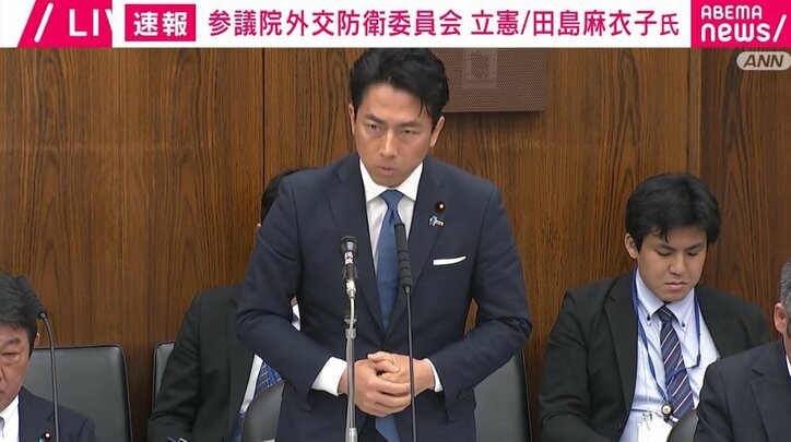 「自衛隊員の国歌歌唱」めぐり国会紛糾→与野党の理事が「退室」する事態に! 「ちょっとひどい答弁。どう考えてもおかしい」何が起きた? 速報,会見 2026/04/14 16:29 拡大する 14日、参議院外交防衛委員会で立憲民主党の田島麻衣子議員が、自民党大会での自衛官による国歌歌唱を巡り、小泉進次郎防衛大臣を厳しく追及した。 田島議員は冒頭「自民党大会で陸上自衛隊所属の自衛官が、国歌斉唱を行ったという点について、小泉大臣に伺いたいと思います」と切り出し、「今回の陸上自衛隊所属の自衛官の方の国歌斉唱、これは、自衛官の政治的行為を制限する自衛隊法第61条に抵触するのではないでしょうか?」と質問。 続きを読む