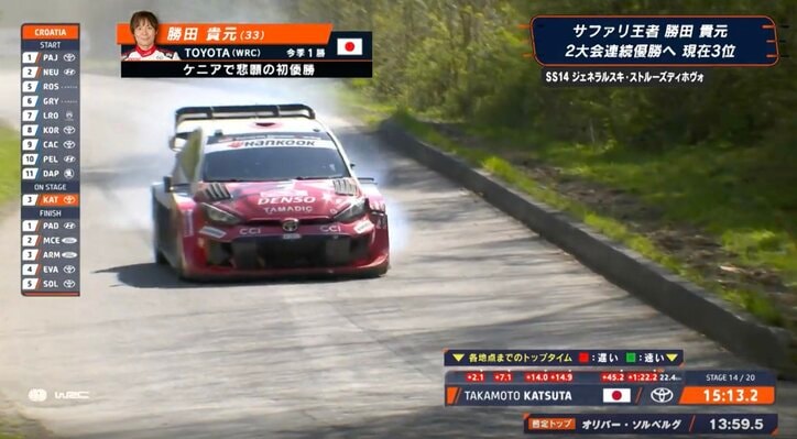 「うそだろ」大荒れ世界ラリーで“タイヤ破断”も大激走 日本人ドライバー、劇的Vを呼んだ衝撃光景に「ボロボロやん」驚く声 WRC 2026/04/15 07:00 拡大する 【WRC世界ラリー選手権】第4戦 ラリー・クロアチア(4月10日〜12日) 4月12日、WRC(世界ラリー選手権)の第4戦が行われ、トヨタの勝田貴元が日本人史上初の2連勝を飾った。多くのドライバーが路面状況に悩まされたラリーだったが、実は勝田も思わぬアクシデントに見舞われた。 今年からホストタウンをアドリア海沿いのリエカに変更したラリー・クロアチア。路面は基本的にターマック(舗装路)だが、一歩でもコースを外れると砂利や石だらけで、コーナーをより攻めたコースでインカットすれば、たちまち舗装路上に石や砂がかき出され、後続のマシンにとって難しい環境となる。 続きを読む