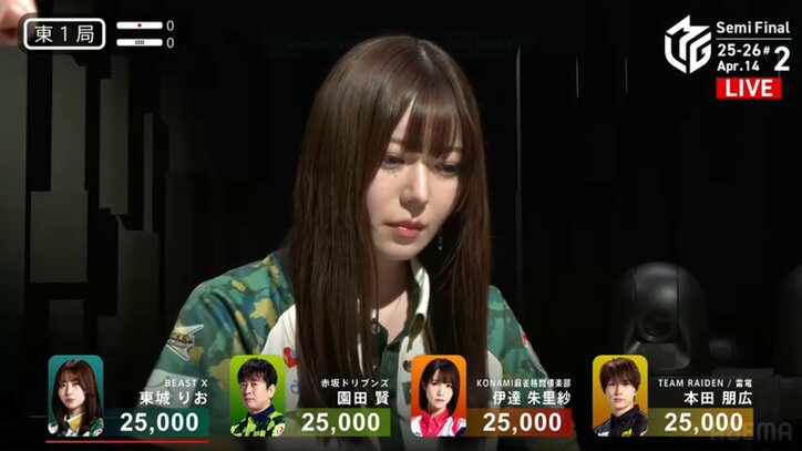 アレンジなしでもパーフェクト!美女雀士・東城りおの“つやつや”ストレートヘアが大好評「美しすぎる」「シンプルがいい」美脚にも注目/麻雀・Mリーグ Mリーグ 2026/04/15 12:00 拡大する 「ZOZOTOWN Mリーグ2025-26」セミファイナルシリーズ、4月14日の第2試合でBEAST Xの「ミス・パーフェクト」こと東城りお(連盟)が、装飾を削ぎ落とした正統派の美しさで試合会場を魅了した。 スケールの大きな雀風と圧倒的なビジュアル、そしてモデルのようなスレンダースタイルを兼ね備える東城。普段の試合では、気合の入ったツインテールや大きなリボンなど、趣向を凝らしたヘアアレンジでファンを楽しませてきた。しかし、この日は一転。前髪をきれいに揃え、潤いあふれる「つやつや」のストレートヘアで登場した。 続きを読む