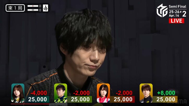 やんちゃに行こうぜ!イケメン貴公子・本田朋広、迷いなしのテンパイ即リーチが生んだ「点数8倍」の離れ業 本人も「気持ちよかったっすね」とニンマリの一撃/麻雀・Mリーグ Mリーグ 2026/04/15 13:00 拡大する 「ZOZOTOWN Mリーグ2025-26」セミファイナルシリーズ、4月14日の第2試合でTEAM雷電の本田朋広(連盟)が、その攻撃的な雀風を象徴するような電光石火のアガリを見せつけた。 試合開始早々の東1局。本田の配牌にはピンズで2面子が完成しており、123の三色同順も視野に入る好形。ここから無駄なく手なりで進めると、わずか5巡目に急所のカン六万を引き入れ、早くもテンパイ一番乗りを果たす。 待ちはカン2索。現状の役はリーチのみ。打点アップのための手変わりを待つ選択肢もあったが、今シーズンの本田に迷いはなかった。迷わずリーチを発声し、自らのツモ力に勝負を託す。これこそがファンの愛する「やんちゃ」な攻めだ。 続きを読む