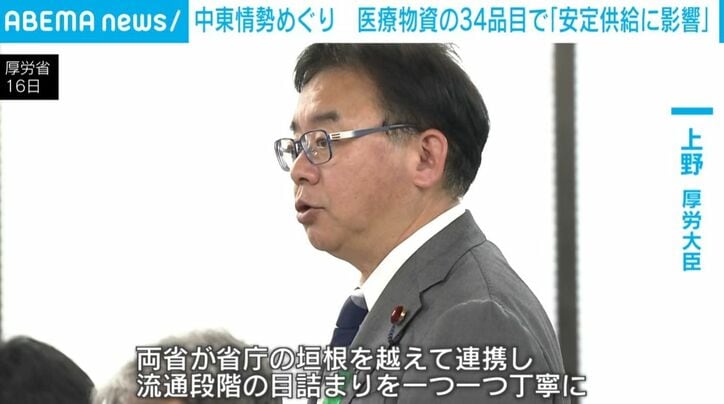 中東情勢めぐり 医療物資の34品目で「安定供給に影響」 速報 2026/04/16 18:08 拡大する イラン情勢による医療物資への影響をめぐり、政府はおよそ3000の医療機関などから相談が寄せられていると明らかにしました。赤沢経産大臣「足元では、一部で供給の偏りや流通の目詰まりが生じているものと認識をしています」上野厚労大臣「両省が省庁の垣根を越えて連携し流通段階の目詰まりを一つ一つ丁寧に解消していくことで医療物資等の安定供給を実現できる」 厚生労働省によりますと、3月中旬から今月13日までに全国およそ3000の医療機関や卸業者から医療物資の供給不足などについて相談が寄せられています。半数以上が医療用の手袋に関する相談だということです。 続きを読む