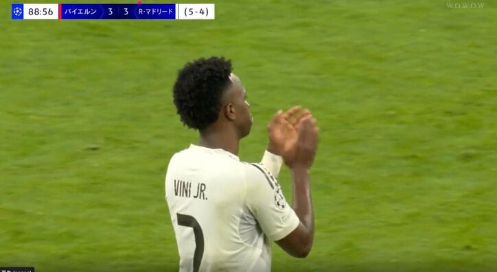 試合終盤で痛恨の失点だっただけに、FWキリアン・エンバペは、信じられないとばかりに仰ぎながら首を横に振る。一方、ヴィニシウスは、頷きながら拍手。衝撃のゴールを決めたルイス・ディアスに向けてのものか、痛恨の失点を喫した味方への皮肉か、カマヴィンガを退場させた主審に向けられたものか。真意は定かではないが、衝撃のパフォーマンスは中継映像に映し出されていた。