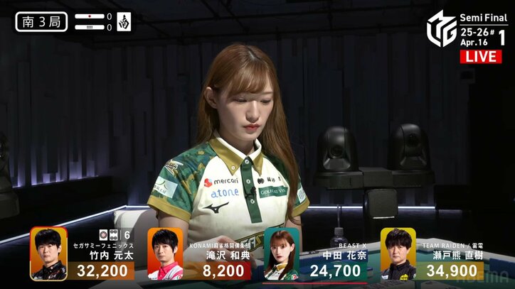「もうやだぁっていう声が聞こえてきそう」美女雀士・中田花奈の“何切る”困り顔が艶っぽい/麻雀・Mリーグ Mリーグ 2026/04/17 12:00 拡大する 「ZOZOTOWN Mリーグ2025-26」セミファイナルシリーズ、4月16日の第1試合でBEAST Xの中田花奈(連盟)が、幾重にも重なる包囲網の中で見せた「困り顔」に、視聴者の注目が集まった。 場面は南3局。親番を迎えた中田は2万4700点持ちの3着目。トップ目のTEAM雷電・瀬戸熊直樹(連盟)とは約1万点差で、満貫級のアガリが出れば一気にトップ戦線に踊り出る勝負どころだった。配牌もマンズの2面子を中心にタンピン系が狙えるチャンス手で、3巡目には早くもイーシャンテンへと手を進めた。 続きを読む