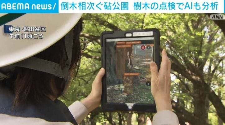 倒木相次ぐ砧公園 樹木の点検でAIも分析 速報 2026/04/17 16:46 拡大する 東京・世田谷区の砧公園で倒木が相次いだことを受けて、東京都は、樹木の専門家による点検に加えてAIを活用する実証実験を行いました。横田陸記者「職員がタブレットで樹木の写真を撮っています。この後AIによる分析が行われます」 砧公園では先月以降、サクラやコナラの倒木が相次いでいて、女性が下敷きになるなどの被害が出ました。 東京都は、8日から始めている樹木の専門家による調査に加えて、きょう、AIによる点検の実証実験を行いました。撮影した樹木の写真を専用のアプリに入力すると、AIがそれらを分析して詳しい診断が必要かどうか予測するということです。 続きを読む