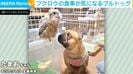 フクロウの赤ちゃんの食事をガン見するブルドッグが、SNSで話題となっている。