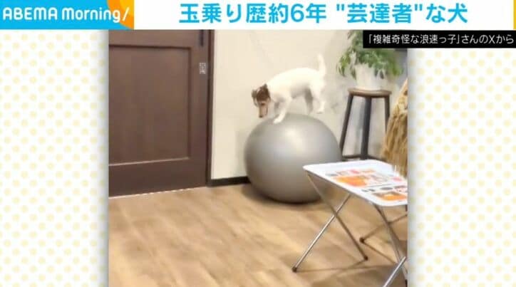 バランスボールを乗りこなし、カメラ前でキメ顔する犬に「すごーい特技!」「ボトルがずらーっと並んでるから、ドキドキした…」など反響 ABEMA Morningどうぶつ 2026/04/18 11:45 拡大する バランスボールを乗りこなし、カメラ前でキメ顔をする犬に絶賛の声があがっている。 バランスボールにヒョイっと乗って、器用に操りながら、だんだんカメラのほうへ。そして、止まったと思ったら、キメ顔。見事な芸を披露してくれたのは、ジャックラッセルテリアのシャーロットちゃん(9歳)だ。実は、玉乗り歴が6年ほどというシャーロットちゃん。飼い主によると、玉乗りが好きすぎて、ずっと乗っているので、最近は封印していたんだとか。 続きを読む