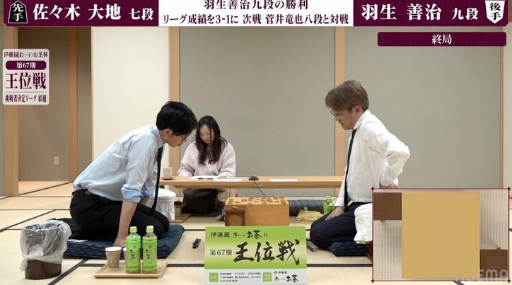 羽生善治九段の「快勝譜」で王位挑戦権獲得へ前進!佐々木大地七段に勝利し紅組首位タイの3勝1敗/将棋・王位戦挑戦者決定リーグ 将棋羽生善治 2026/04/18 07:30 拡大する 将棋の伊藤園お~いお茶杯第67期王位戦・挑戦者決定リーグ紅組が4月17日、東京・千駄ケ谷の将棋会館で行われ、永世王位資格保持者の羽生善治九段(55)が佐々木大地七段(30)に104手で勝利した。藤井聡太王位(竜王、名人、棋聖、棋王、王将、23)への挑戦権を争う王位リーグで、羽生九段は紅組での成績を3勝1敗とし、前期挑戦者の永瀬拓矢九段(33)と並んで首位タイに浮上。紅組優勝へ大きく前進した。 本局は、佐々木七段の先手番で角換わりの出だしに。ABEMAでテキスト解説を務めた高田明浩五段(23)は「羽生先生の積極的な攻めと佐々木先生の受けという将棋でした」と総括した。また、「(羽生九段は)途中まで佐々木先生のしっかりした受けに苦労していましたが、70手目の歩成が好手で、形勢が傾きました。そこからは羽生先生が上手くまとめた快勝譜だと思います」とコメントした。 続きを読む