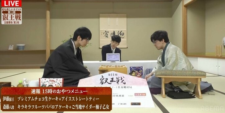 将棋の第11期叡王戦五番勝負第2局が4月18日、石川県加賀市の「アパリゾート佳水郷」で行われ、伊藤匠叡王(王座、23)と挑戦者の斎藤慎太郎八段(32)が対局中だ。午後3時には午後のおやつタイムを迎え、両者が注文したスイーツが紹介されると、斎藤八段のあまりにも可愛らしいチョイスに視聴者から大きな反響が寄せられた。
