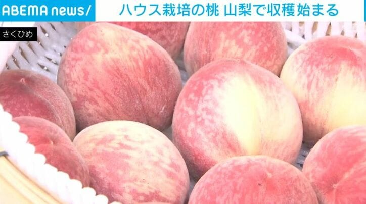 ハウス栽培の桃の収穫始まる 速報 2026/04/19 08:54 拡大する モモの生産量日本一を誇る山梨県で、早くもハウス栽培のモモの収穫が始まりました。 山梨県甲州市のビニールハウスでは、たわわに実ったモモを一つ一つ丁寧にもぎ取って収穫していきます。 18日、初収穫を迎えたのは、「さくひめ」という収穫するまでの期間が短い品種です。温度と水分が適切に管理されたビニールハウス内で栽培され、酸味が少ないため甘みを強く感じられるのが特徴です。今年の生育は良好で、「玉張り」も良く仕上がったということです。 続きを読む