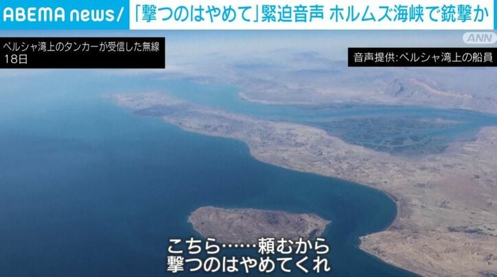 「撃つのはやめて」緊迫の無線音声 ホルムズ海峡で銃撃か 速報 2026/04/19 10:55 拡大する ホルムズ海峡周辺で船舶への攻撃が相次いで報告されるなか、攻撃を中止するよう求める無線の音声を独自に入手しました。ペルシャ湾上のタンカーが受信した音声「イランの革命防衛隊海軍に告ぐ。こちら……頼むから撃つのはやめてくれ、撃つのはやめてくれ。エンジンを止める。エンジンを止めるから、いいか?」 この音声は18日、ペルシャ湾上のタンカーの船員がほかの船から発せられた無線を受信し、録音したものです。 音声との関連は不明ですが、インドの外務省は18日、インド船籍の2隻がホルムズ海峡で銃撃を受けたと明らかにしました。在インドのイラン大使を外務省に招集し、重大な懸念を伝えたとしています。 続きを読む