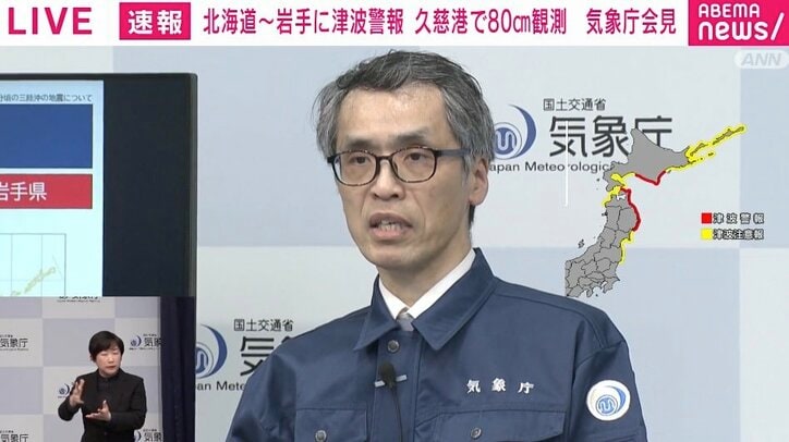 気象庁「1週間程度、特に今後2、3日は最大震度5強程度の地震に注意」東北地方で最大震度5強の地震 1896年に明治三陸地震、1994年に三陸はるか沖地震発生の場所周辺 速報,会見 2026/04/20 19:32 拡大する 20日16時53分頃、三陸沖を震源とする最大震度5強の地震が発生し、北海道太平洋沿岸中部、青森県太平洋沿岸、岩手県に津波警報が発表されたことを受け、18時に気象庁が会見を開いた。 気象庁は「現在、津波警報を発表し、津波も観測しています。沿岸部や川沿いにいる人は、すぐに高台や避難ビルなど安全な場所に避難をしてください。また、すでに避難をしている方につきましては、避難の継続をお願いいたします」と、命を守るための行動を強く呼びかけた。 続きを読む