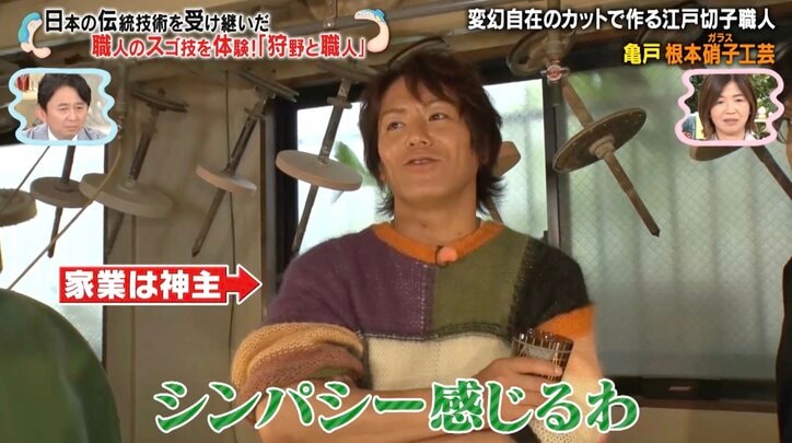 祖父は“江戸切子界のレジェンド” 36歳孫、大学中退後の“プラプラ生活”経て3代目を継いだ過去「祖父が亡くなって…」 マツコ&有吉 かりそめ天国 2026/04/21 12:15 拡大する “江戸切子界のレジェンド”を祖父に持つ孫が、家業を継いだ理由を明かす場面があった。 4月17日に放送された『マツコ&有吉 かりそめ天国』(テレビ朝日系)では、日本の伝統技術を受け継いだ職人のスゴ技を狩野英孝が体験するロケ企画を放送。その一箇所目として、東京・亀戸にある「根本硝子工芸」を訪れた。 出迎えてくれたのは、職人歴44年の根本達也さん(63)と、息子で職人歴12年の幸昇さん(36)の親子。江戸切子は、ガラスの表面をカットして模様を描く、江戸時代に東京で誕生した工芸品。東京に約50軒の工房があるが、根本硝子工芸は常識にとらわれない「曲線」を駆使した立体感のあるグラス作りで、国内最大のコンクールを何度も受賞している名工だ。初代である幸昇さんの祖父・幸雄さんは、江戸切子界で初めての黄綬褒章を受章した“レジェンド”だ。 続きを読む