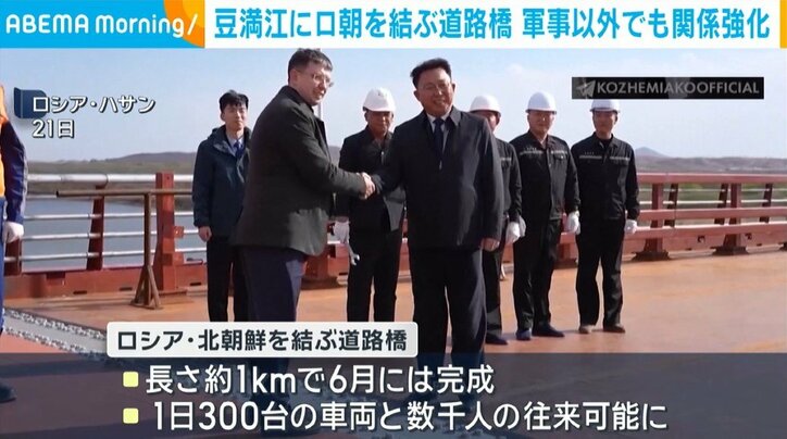 豆満江にロ朝を結ぶ道路橋 軍事以外でも関係強化 速報 2026/04/22 09:30 拡大する ロシアと北朝鮮が関係の強化を続けるなか、両国を結ぶ道路橋を繋ぐ「締結式」が開かれました。 21日、ロシア沿海地方のハサンと、北朝鮮の羅先の間を流れる豆満江に架かる橋の様子を捉えた映像では、旗の下で開かれた締結式に関係者らが集まっている様子がうかがえます。 長さおよそ1キロの橋は6月には完成し、現地メディアは1日300台の車両と数千人の行き来が可能になると伝えています。 これまで両国の国境には鉄道橋しかありませんでした。 続きを読む