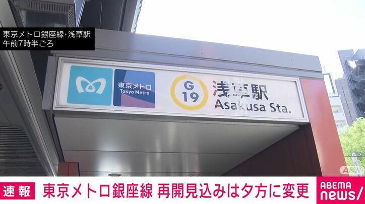 東京メトロ銀座線 再開見込みは夕方に変更 速報 2026/04/22 11:40 拡大する 浅草駅で発煙があった影響で一部区間で運転を見合わせている東京メトロ銀座線の再開見込みは、正午ごろから夕方ごろに変更されました。 東京メトロなどによりますと、午前6時半ごろ、東京メトロ銀座線の浅草駅の線路内で発煙が確認されました。 駆け付けた消防隊によって火はすぐに消し止められましたが、線路を切り替えるためのケーブルなどが損傷したということです。 銀座線は浅草駅から三越前駅の間の上下線で運転を見合わせていて、再開は正午ごろを見込んでいましたが、先ほど、夕方ごろに変更されました。 続きを読む