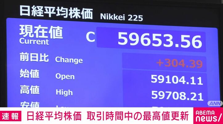 日経平均株価 取引時間中の最高値更新 速報 2026/04/22 12:58 拡大する 日経平均株価が取引時間中の最高値を更新しました。 きょうの東京株式市場ではアメリカとイランの停戦期間延長で先行きの不透明感が払拭されず、日経平均株価は取引開始直後から売りが先行しました。 しかし協議継続への期待感からその後上昇に転じました。 日経平均株価に影響の大きい一部のAI・半導体関連銘柄の上昇を反映して16日につけた取引時間中の最高値5万9688円を更新しました。 午前の終値はきのうより304円高い5万9653円でした。(ANNニュース) 続きを読む