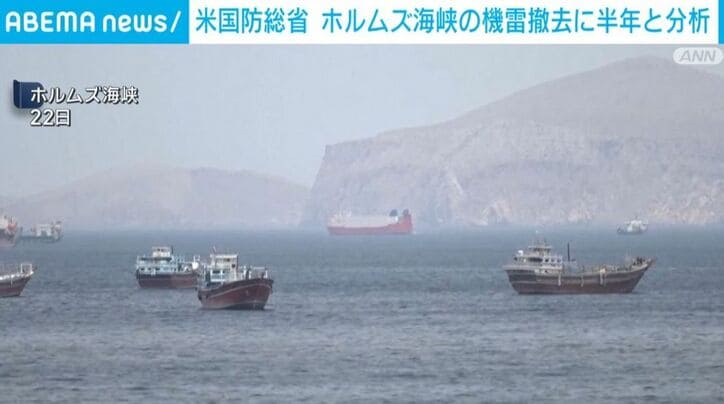 米国防総省 ホルムズ海峡の機雷撤去に半年と分析 速報 2026/04/23 15:22 拡大する ホルムズ海峡周辺に20個以上の機雷があり、除去に6カ月かかる可能性があるとアメリカの国防総省が分析していることが分かりました。 ワシントン・ポストによりますと、国防総省は21日に、議会下院の軍事委員会に機密情報の報告をし、イランがホルムズ海峡とその周辺に機雷を20個以上敷設した可能性があると説明したということです。 また、機雷を完全に除去するには6カ月かかる可能性があると分析しています。 さらに、除去に関連する作業はイランとの戦闘が終わるまで実施される可能性は低いとしています。 続きを読む