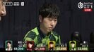 5巡目、渡辺は9索を暗刻にしてカン2索待ちでテンパイ。役は混一色・ダブ東・一盃口・赤・ドラ3。この時点で10翻、親の倍満という恐るべき破壊力が確定。そこへ、東1局に役満を決めたトップ目の下石がタンピン系の先制リーチで勝負を挑む。