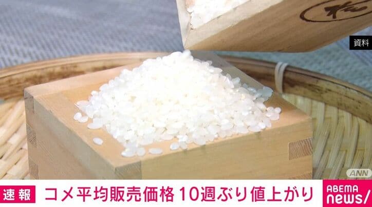 コメ平均販売価格 10週ぶり値上がり 速報 2026/04/24 18:28 拡大する コメの平均販売価格が10週ぶりに値上がりに転じました。 農林水産省によりますと、4月19日までの1週間に全国のスーパーおよそ1000店舗で販売されたコメの平均価格は、5キロあたり3883円と前の週と比べて10円値上がりしました。 6週連続で4000円を下回ったものの、値上がりは2月上旬以来10週ぶりです。 銘柄米は6円高い3947円、ブレンド米は17円高い3676円と、いずれも小幅に値上がりしました。 続きを読む
