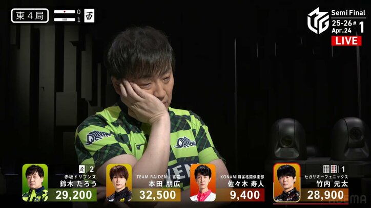 「これが止まるんですか」と驚愕の声 鈴木たろう、誰もが一発放銃やむなしと諦めた状況からの“神セーブ”がすごい「でたゼウスの選択」/麻雀・Mリーグ Mリーグ 2026/04/25 10:00 拡大する 「ZOZOTOWN Mリーグ2025-26」セミファイナルシリーズ、4月24日の第1試合で、赤坂ドリブンズの「ゼウス」こと鈴木たろう(最高位戦)が、絶体絶命の局面で文字通りの“神回避”を見せ、卓上を震撼させた。 場面は東4局1本場。2万9200点持ちの2着目だったたろうは、第1ツモからソウズが8枚という手牌を手にし、迷わずソウズの混一色へ舵を切る。次々とソウズ、字牌を集めると、10巡目には發を重ねて混一色・七対子のテンパイ。待ちは山に2枚残りの北単騎、しかも他家からの警戒を考慮した冷静なダマテンを選択した。 続きを読む