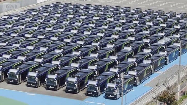 整然と止められたEVバス。その台数は135台です。大阪メトロが万博に訪れた客を運んでいましたが、事故や不具合が相次ぎ、今は使われていません。“まるでバスの墓場”と揶揄(やゆ)する声も出ています。