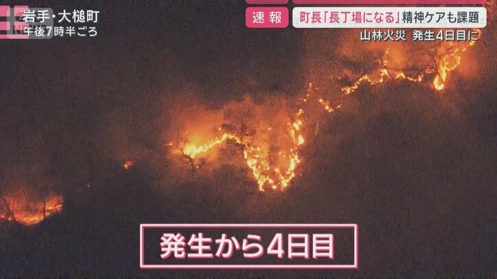 発生から4日目となった25日も、火の手は、山を燃やし続けています。午後6時に会見を開いた大槌町長は、「長丁場になる」との見解を示しました。