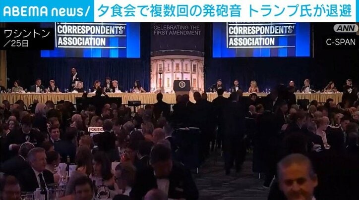 夕食会で複数回の発砲音 トランプ氏が退避 速報 2026/04/26 19:04 拡大する ワシントンのホテルで開かれていたホワイトハウス記者会主催の夕食会の会場で発砲事件があり、会場にいたトランプ大統領が退避しました。梶川記者「晩餐会は中断され会場はまだ騒然とした状況が続いています。トランプ大統領はステージをすでに離れています」 25日、トランプ氏参加の夕食会が開催されたホテルで複数回の発砲音が聞こえ、会場は一時騒然となりました。トランプ氏はすぐに会場から退避し無事でした。その後、トランプ氏は自身のSNSを更新し、容疑者が逮捕されたと明かしました。 続きを読む