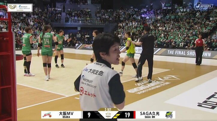 女子バレー、黄色いビブスで公式戦に!? 突然現れた“目立ちすぎる”リベロにファン驚き SVリーグ 2026/04/27 10:02 拡大する 【SVリーグ】SAGA久光スプリングス 3ー0 大阪マーヴェラス(4月26日・女子CS決勝) 女子バレーの頂上決戦で、珍しい交代シーンがあった。リベロの選手が負傷で退くと、代わりの選手がユニフォームではなくビブスを着て登場し、ファンが驚きの声を挙げた。 4月26日に大同生命SVリーグ女子のチャンピオンシップ(CS)ファイナルの第2戦が行われ、レギュラーシーズン4位の大阪マーヴェラスは同2位のSAGA久光スプリングスと対戦。前日、2戦先勝で優勝を決める戦いの第1戦をフルセットの末に落としていた大阪MVは、2セットを奪われて迎えた試合終盤、さらに窮地に立たされてしまった。 続きを読む