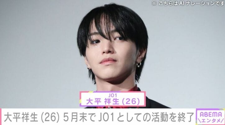 JO1 大平祥生(26)、5月末でグループでの活動終了「深く反省」「JO1とJAMの皆さまに会えたことは一生の宝物」2025年10月に「規定に反する事案」が発覚 ABEMAエンタメ 2026/04/27 14:01 拡大する グローバルボーイズグループ「JO1」の大平祥生さんが、5月31日でグループとしての活動を終了することがわかりました。 4月27日、グループの公式サイトで所属事務所は、「このたび、大平祥生は、2026年5月31日をもちまして、株式会社LAPONEエンタテインメントとの専属マネジメント契約を終了し、JO1としての活動を終了しますことを、ご報告申し上げます」と、発表。 また、大平さんもファンに向けてコメントを発表していて、「JAMの皆さま、活動休止からご報告が遅くなってしまったこと、本当に申し訳ございません。約半年の間、自分なりにこれからの人生について深く考え、事務所とも話し合いを重ねてまいりました。その結果、JO1としての活動を終了することといたしました。これまで応援してくださっていた皆さまには、突然のご報告となってしまいましたこと、心よりお詫び申し上げます。私自身の至らなさや未熟さから、JAMの皆さまに多大なるご迷惑をおかけしてしまったことを、深く反省しております。また、メンバーや事務所スタッフの皆さま、関係者の皆さまにも、多くのご迷惑をおかけしてしまいましたこと、改めて深くお詫び申し上げます。これからは別の道を歩むことになりますが、これまでの経験を大切にし、感謝を忘れず、歩んでいきたいと思います。JO1とJAMの皆さまに会えたことは一生の宝物です」と、つづっています。 大平さんは2025年10月、「規定に反する事案」が発覚したことにより活動を休止していました。(『ABEMA NEWS』より) 続きを読む