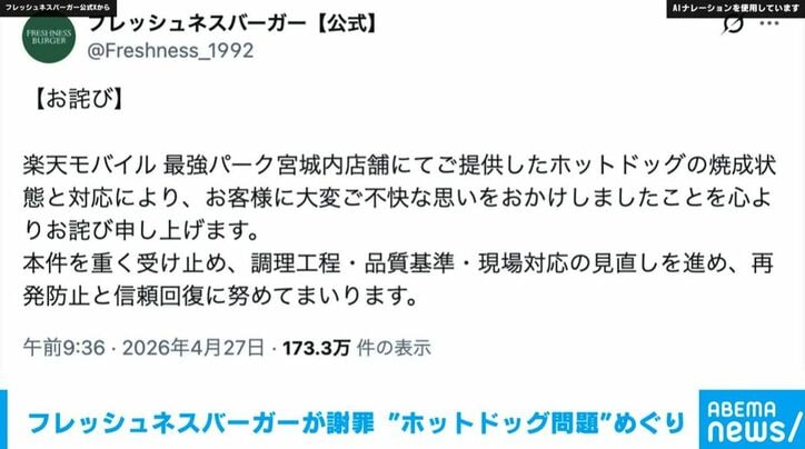 フレッシュネスバーガーが謝罪 “ホットドッグ問題”めぐり 速報 2026/04/27 16:55 拡大する フレッシュネスバーガーが公式Xを更新しました。「【お詫び】楽天モバイル 最強パーク宮城内店舗にてご提供したホットドッグの焼成状態と対応により、お客様に大変ご不快な思いをおかけしましたことを心よりお詫び申し上げます。本件を重く受け止め、調理工程・品質基準・現場対応の見直しを進め、再発防止と信頼回復に努めてまいります」(『ABEMA NEWS』より) 続きを読む