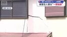 クレーン車の先端は住宅の屋根を突き破り、外壁にも大きなひびがはいっていて、窓枠も歪んでいます。
