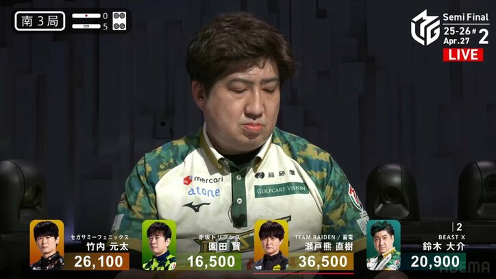 突然のトップギア 猛獣雀士、感性の1巡回しが読んだ一発跳満ツモ ファンも愕然の事態「未来視やん」「乱数調整成功」/麻雀・Mリーグ Mリーグ 2026/04/28 14:00 拡大する 「ZOZOTOWN Mリーグ2025-26」セミファイナルシリーズ、4月27日の第2試合でBEAST X・鈴木大介(連盟)が、勝負師の直感が導いた芸術的な「1巡回し」から衝撃の跳満をアガりきり、視聴者を熱狂させた。 場面は南3局5本場。2万900点持ちの3着目だった大介は、トップを走る親番のTEAM雷電・瀬戸熊直樹(連盟)を追う勝負どころ。手牌はタンヤオや三色同順を狙える形から、引きに連動して七対子へとシフト。9巡目に赤五万を組み込んだタンヤオ・七対子のテンパイを入れると、大介は三万ではなく4索単騎を選択し、まずは静かにダマテンに構えた。 続きを読む