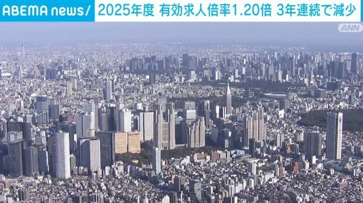 厚生労働省によりますと、仕事を求める人1人あたりに何件の求人があるかを示す有効求人倍率について、2025年度の平均は1.20倍となり、前の年度から0.05ポイント下落しました。3年連続での減少になっています。