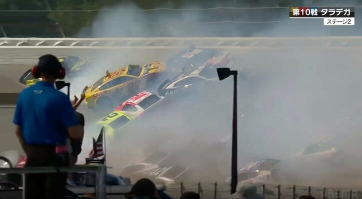 米レース史上最大級!26台絡む巨大クラッシュの一部始終 バックでピットへ…斜めに走る車も コース上が白煙に包まれる大惨事 NASCAR 2026/04/29 06:19 拡大する 【NASCAR】第10戦 ジャック・リンクス500(日本時間4月27日/タラデガ・スーパースピードウェイ) アメリカで圧倒的な人気を誇るストックカーレース、NASCAR(ナスカー)の第10戦「ジャック・リンクス500」が開催。超高速オーバルとして知られるタラデガで、合計26台が巻き込まれるNASCAR史上最大級の大クラッシュが発生し、コース上が白煙に包まれる大惨事となった。 第2ステージの115周目、先頭集団が高速で4列(4ワイド)の塊となってメインストレートを駆け抜けていた際に悲劇は起きた。トップを走っていた23号車のバッバ・ウォレスに対し、後続の1号車ロス・チャステインがプッシュ。この衝撃で23号車がウォールへ弾かれるようにスピンすると、後続マシンが行き場を失い、次々と連鎖的に激突した。 続きを読む