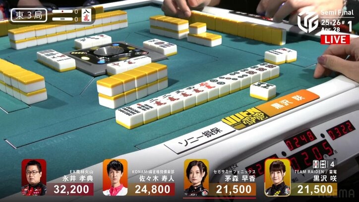 私の親番になんてことを…超速で流された一局に天才女流雀士・茅森早香の目がギラリ「おこもりw」「これはオコよねぇ」/麻雀・Mリーグ Mリーグ 2026/04/29 10:00 拡大する 「ZOZOTOWN Mリーグ2025-26」セミファイナルシリーズ、4月28日の第1試合で、セガサミーフェニックス・茅森早香(最高位戦)が、大事な親番をあっという間に流され、カメラがその鋭い眼光を捉えた。 場面は東3局。茅森は2万1500点持ちの同点3着目だった。ファイナルシリーズ進出へ向けてトップが至上命令となる一戦、親番の配牌はドラの八万を1枚内蔵し、両面ターツも豊富な勝負手だった。しかし、そのチャンスを無慈悲に打ち砕いたのがTEAM雷電・黒沢咲(連盟)だ。 続きを読む