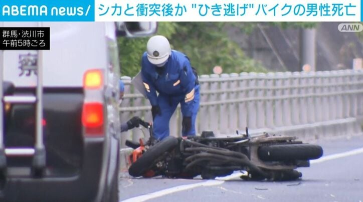 シカと衝突か 後続車が“ひき逃げ” バイクの男性死亡 速報 2026/04/29 11:11 拡大する 群馬県渋川市の自動車専用道路で、バイクの近くで倒れていた男性の死亡が確認されました。警察はひき逃げ事件として捜査しています。 29日午前1時半ごろ、渋川市川島の上信自動車道で「バイクと人が倒れており倒れている人をひいた車は逃走した」と目撃者から110番通報がありました。 警察によりますと、バイクの近くに倒れていたのは高崎市の会社員・野口正己さん(61)で搬送先の病院で死亡が確認されました。 野口さんは後続してきた少なくとも2台の車に轢かれたとみられ、そのうち1台は現在も逃走中です。現場では死んだシカも見つかりました。 続きを読む