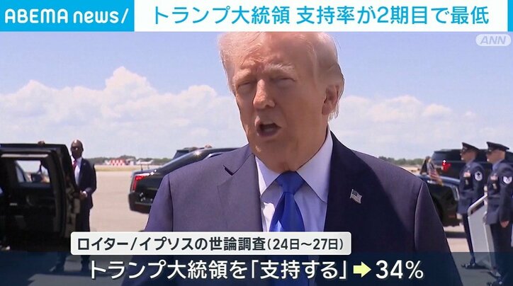 トランプ大統領 支持率が2期目で最低 速報 2026/04/29 16:54 拡大する ロイター通信などが実施した最新の世論調査で、アメリカのトランプ大統領の支持率が第2次政権が発足して以来、最低を記録しました。 ロイター通信と世論調査会社「イプソス」が24日から27日にかけて行った世論調査によりますと、トランプ大統領を「支持する」と答えた人は34%でした。 前回の調査から2ポイント低下し、去年1月の第2次政権の発足後、最も低くなりました。また、生活費に関するトランプ政権の対応を支持すると答えた人は22%にとどまりました。 続きを読む