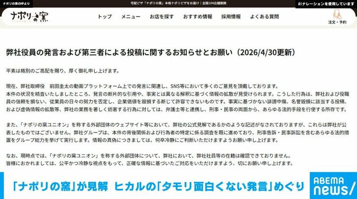 「ナポリの窯」が見解公表 ヒカルの「タモリ面白くない発言」めぐり 速報 2026/04/30 19:33 拡大する 「ナポリの窯」からの発表です。「弊社役員の発言および第三者による投稿に関するお知らせとお願い現在、弊社取締役 前田圭太の動画プラットフォーム上での発言に関連し、SNS等において多くのご意見を頂戴しております。 本件の状況を精査いたしましたところ、発言の断片的な引用や、事実とは異なる解釈に基づく情報の拡散が見受けられます。こうした行為は、弊社および役職員の信頼を損ない、従業員の日々の努力を否定し、企業価値を毀損する断じて許容できないものです。事実に基づかない誹謗中傷、名誉毀損に該当する投稿、および虚偽情報の拡散等、弊社の業務を著しく妨害する行為に対しては、弁護士等と連携し、刑事・民事の両面から、あらゆる法的手段を行使する所存です。 続きを読む