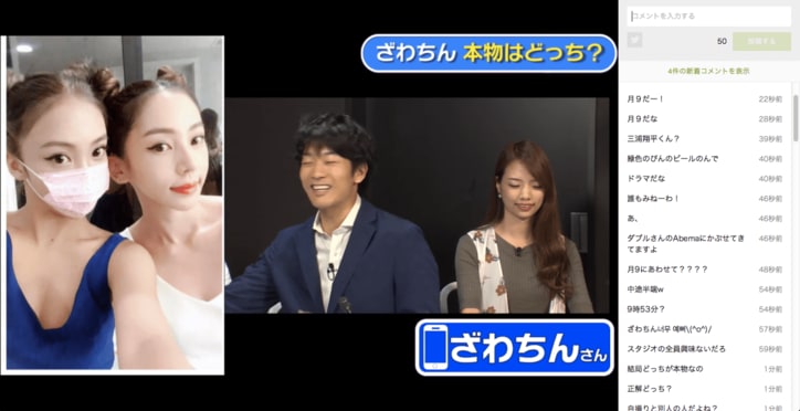 ざわちん「月9」ものまねメイクに挑戦? 正解は今夜9時53分に… 2019/10/24 17:57 拡大する 12日放送された『芸能㊙チャンネル』(AbemaTV)にものまねメイクで人気のタレントざわちんが電話出演。今夜新作を披露すると宣言した。 ざわちんによるとブログを更新するのは9時53分頃。1人ではなく、複数人のものまねメイクを披露するという。 「9時53分」という半端な時間帯にスタジオやコメント欄では推理合戦で大盛り上がり。番組にパネラーとして出演中のサイバーエージェント社員の密山礼巳氏が「もしかして私と菊池さんがハマっているドラマの…」と推理すると、ざわちんも「分かっちゃいましたか」と否定せず、コメント欄でも「月9!?」と質問が相次いだ。 続きを読む