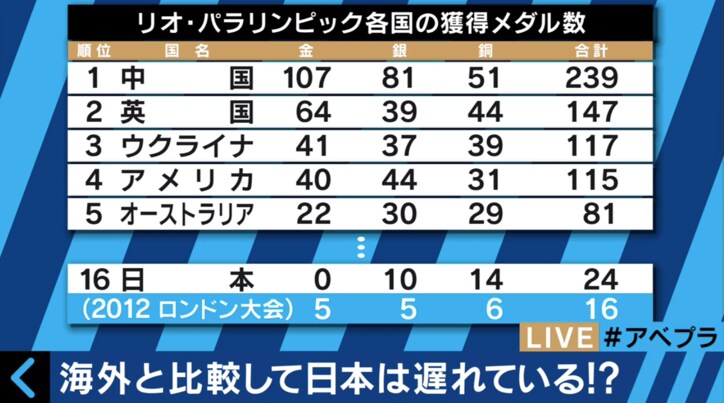 パラリンピックで初の金メダルゼロ、原因は「日本の国策不足」? 国をあげた協力体制が必要か 2016/09/20 03:00 拡大する リオパラリンピックが18日をもって終了したが、今回日本は史上最高の数となるメダル24個を獲得。2012年ロンドン大会の16個を上回った。ただし、ロンドンでは5個の金メダルを獲得したが、今回は金メダルはゼロ、銀メダルが10、銅メダルが14という結果になった。日本が金メダル獲得ゼロに終わったのは1964年東京大会に初参加してから初めてのこと。今回の結果について、北京パラリンピックの車いす陸上400mT52 と800mT52で金メダルを獲得し、ロンドンパラリンピック400mT52で銀メダルを獲得した伊藤智也氏がAbemaTVの報道番組『AbemaPrime』にSkypeで登場。今回の結果に意見した。 続きを読む