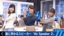 気象予報士・穂川果音が「これ浮かなくてもいいですよね?」と製品の特徴について冷静な指摘をすると、元NMB48・山田菜々が「今までのスピーカーは壁や床に面して設置されてるケースが多いですよね。それだと、壁や床を伝ってご近所さんに聞こえてしまいがち。これは、このように浮かぶことによってご近所への騒音が軽減されるんです」と、浮かぶ意味を説明した。
