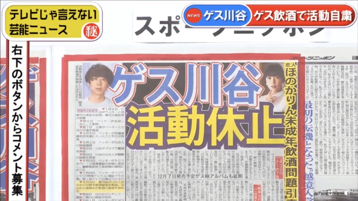 ゲス川谷、活動自粛 芸能リポーター「今、ベッキーはチャンスですよ」 2019/10/24 21:28 拡大する ロックバンド・ゲスの極み乙女。の川谷絵音(27)との交際、未成年だった先月の飲酒が浮上したタレントのほのかりん(20)。10月4日に20歳になったが、その直前の飲酒によりNHK Eテレの『Rの法則』降板となるなど代償は大きかった。さらに、川谷も所属する2つのバンド(ゲス極とindigo la End)の活動を現在案内済みのライブ以外は自粛し、アルバム発売も延期された。 4日に放送された『芸能㊙チャンネル』(AbemaTV)では、この件について取り上げられ、イジリー岡田(52)が解説した。 続きを読む