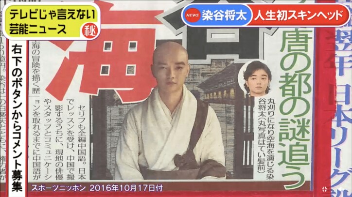 染谷将太、人生初のスキンヘッドに 日中合作映画『空海』主演 2019/10/24 21:28 拡大する 俳優・染谷将太(24)が人生初のスキンヘッドをすることが明らかになった。これは、総製作費150億円の史上最大額となる日中合作映画『空海』に主演するため。同作は、作家・夢枕獏氏の『沙門空海唐の国にて鬼と宴す』の映画化で、2018年に公開される。 平安時代、日本から中国へ渡った僧侶、空海の冒険を描いたストーリーで、今回、染谷は映画『寄生獣』の演技が評価され、オーディションを経ることなく指名が来て主演となった。 続きを読む
