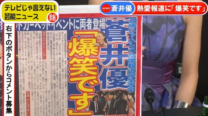 \n蒼井優はバッサリ否定 石崎ひゅーいとの熱愛報道 2019/10/24 21:28 拡大する 映画『アズミ・ハルコは行方不明』で主演を務めた女優の蒼井優(31)が、共演者で熱愛が報じられたシンガー・ソングライター、石崎ひゅーい(32)とともに25日、「第29回東京国際映画祭」のオープニングイベントに登場。そこで蒼井は熱愛報道について問われ、「爆笑です」とコメントしたことが報じられている。 この「爆笑です」という回答を引き出したのは、AbemaTV『芸能(秘)チャンネル』でパネラーを務める菊地真由子氏(40)。26日の同番組では、あべかすみ氏(57)が菊地氏から聞いた話として、現場での様子を生々しく“代打”リポートした。 続きを読む