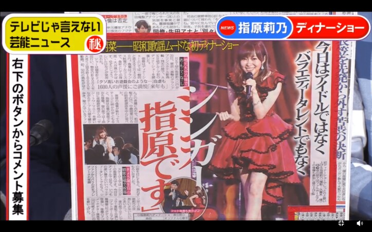 指原莉乃ディナーショーに1600人 AKBの曲はなし 2019/10/24 21:28 拡大する 11月20日、誕生日を翌日に控えたHKT48・指原莉乃(24)が東京・グランドプリンスホテル新高輪の飛天の間でAKBグループ初となる単独ディナーショーを行った。34500円のこのディナーショーには、2回公演で1600人が参加。ディナーショーについて、21日に放送された『芸能(秘)チャンネル』で芸能リポーター・井上公造氏が解説した。 指原のディナーショーに参加した人は40代、50代の男性がほとんど。17曲を歌い、その中には松田聖子や、中森明菜、小泉今日子、モーニング娘。の歌などが入っており、AKBの歌はなかった。また、ショーの途中でフットボールアワーの後藤輝基もゲスト出演し、ギターを披露。山口百恵の名曲「秋桜」を指原の歌声とともに披露したという。井上公造氏は個人の感想として「誰が聞きたいんですかね」と思わず口を滑らした。 続きを読む