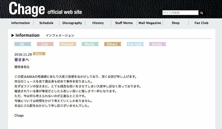 Chage、ASKA再逮捕でコメント「ただ、今は何も考えられない」 2019/10/24 21:28 拡大する 覚せい剤取締法違反(使用)容疑で28日に逮捕されたASKA(本名・宮崎重明)容疑者について、CHAGE and ASKAの相方でシンガー・ソングライターのChageが29日、公式サイトを通じてコメントを発表した。(画像はChageの公式サイトより) Chageは書き出しで「この度はASKAの再逮捕にあたり大変ご迷惑をおかけしており、深くお詫び申し上げます」と謝罪。「先ずはファンの皆さまに、とても残念な思いをさせてしまい大変申し訳なく思っております。報道されている事が事実だとしたら悲しい思いと悔しさで一杯になります」と自身の胸中を明かした。 続きを読む
