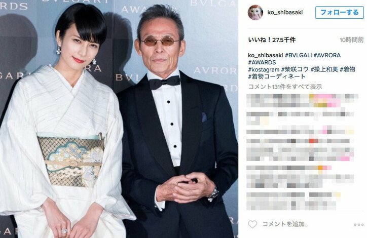 柴咲コウ、黒髪ショートで和服姿を披露 「美しすぎる」と反響 2019/10/24 21:28 拡大する 女優の柴咲コウが11月30日、自身のInstagramを更新。写真家・操上和美とのツーショット写真を公開した。(画像は柴咲コウのInstagramより) 写真は11月29日に東京ミッドタウンで開催した「ブルガリ アウローラ アワード(BVLGALI AVRORA AWARDS)」の授賞式でのもの。同授賞式では、芸能や文化だけに留まらず、政治、経済、医学、社会貢献、スポーツなどさまざまな分野から「多くの人々にインスピレーションを与える女性」を選出し表彰。初開催となる2016年の授賞式では柴咲コウだけではなく、桃井かおり、滝川クリステル、ファッションデザイナーの森英恵、写真家の操上和美、バレエダンサーの倉永美沙、現代美術家のミヤケマイらが登場した。 続きを読む
