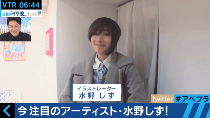 「突然の暴力」「今日も朝からいやがらせ」 強烈な個性で注目の「水野しず」って? 2016/12/06 08:24 拡大する 「ミスiD2015」グランプリ受賞、モデル、イラストレーターとして活躍し、強烈な個性を放つ水野しず氏、27歳。 東京都新宿区の画廊で開かれている個展に足を踏み入れると、水野氏が手がけたド派手で奇妙な作品が並んでいる。作品に関しては「分からなくて大丈夫なんだよ、分からなくても大丈夫なものを描いているから分からなくても大丈夫なんだ」と説明する水野氏。 駆け付けたファンは"アーティスト・水野しず"の魅力について、「どこ行っても何やっても水野しずだって分かるのが魅力的だなと思う。」「エネルギーが込められてるというか、見た時にバッと心臓を掴まれるようなそういう衝撃性がある。」と話す。 続きを読む
