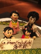 用意されていたのは、成田屋の家紋「三つ枡」型ケーキと、マジパンの人形。マジパンの人形は石川五右衛門姿の海老蔵と妻の小林麻央、長女の麗禾ちゃん、長男の勸玄くんがモデルと思われ、海老蔵は「私だけ人間でない…」と悪役姿の自分が気になる様子。