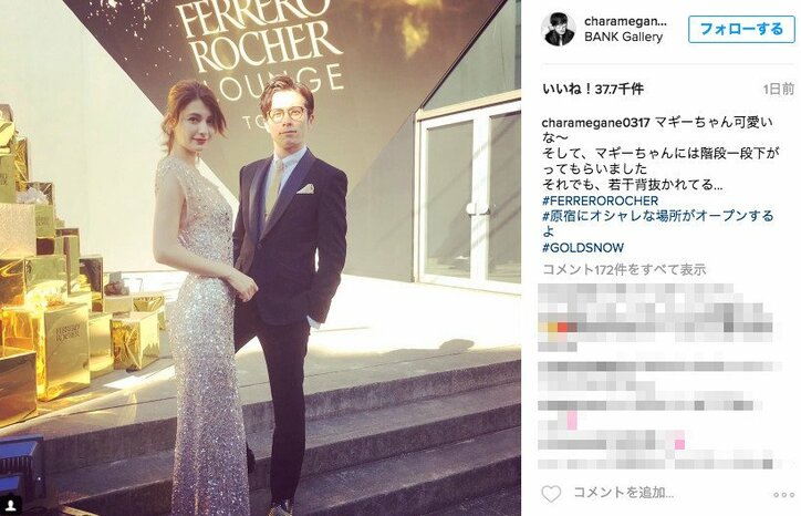 オリラジ藤森、マギーに「背抜かれてる…」 身長差に反響 2019/10/24 21:28 拡大する お笑い芸人・オリエンタルラジオの藤森慎吾が12月8日、自身のInstagramを更新。モデル・マギーとのツーショット画像が話題になっている。(画像は藤森慎吾の公式Instagramより) 同日、東京・表参道のバンクギャラリーで「フェレロ ロシェ ラウンジ トーキョー」オープニングセレモニーに登場した藤森とマギー。「フェレロ ロシェ」は、イタリアのチョコレートブランド。金色の包み紙が印象的な同商品の期間限定バーが、クリスマスを前にオープンしたのだ。 続きを読む