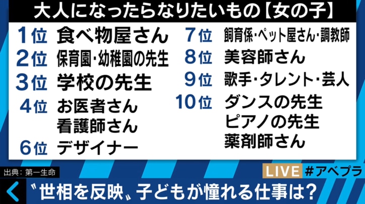 男の子は“競争”、女の子は“協調” 子どもたちの「なりたいものランキング」に現れる日本社会 2017/01/07 12:50 拡大する 7日、「子供が大人になったらなりたいものランキング」が発表された。 これは第一生命が全国の幼児から小学生まで合計1100人を対象に毎年行っているもので、男の子のランキングは となっており、「サッカー選手」が7年連続で1位を獲得した一方、18年間トップ3に入っていた「野球選手」は惜しくも4位に転落。そこに「学者・博士」が2015年の8位から2位へと大きくランクを上げ、トップ3に躍り出た。 これは昨年のノーベル医学生理学賞受賞の大隈良典さんなど、2014年から続く日本人のノーベル賞受賞が大きく影響しているのではと指摘されている。 続きを読む